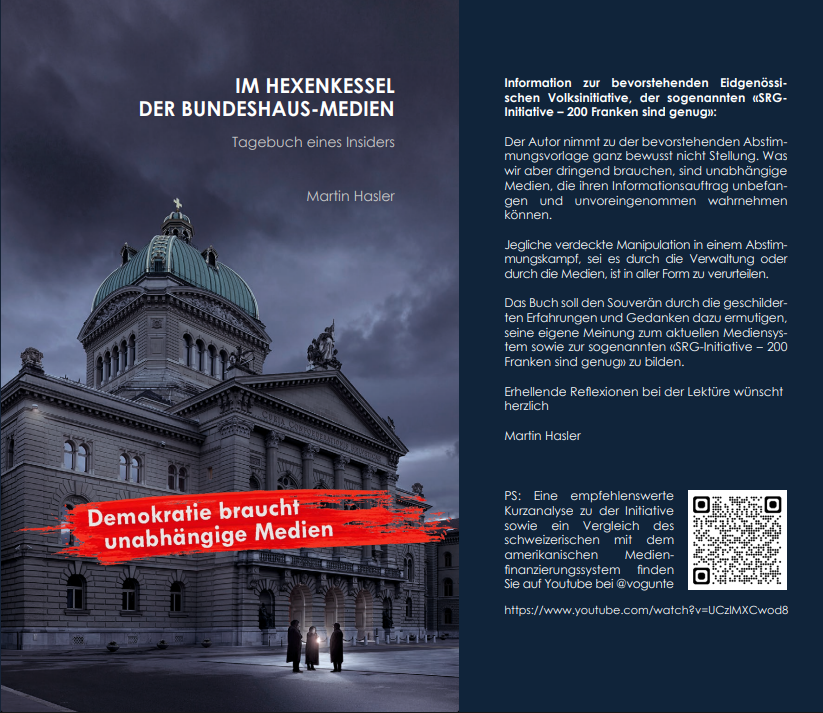Der Autor nimmt zu der bevorstehenden Abstimmungsvorlage ganz bewusst nicht Stellung. Was wir aber dringend brauchen, sind unabhängige Medien, die ihren Informationsauftrag unbefangen und unvoreingenommen wahrnehmen können. Jegliche verdeckte Manipulation in einem Abstimmungskampf, sei es durch die Verwaltung oder durch die Medien, ist in aller Form zu verurteilen. Das Buch soll den Souverän durch die geschilderten Erfahrungen und Gedanken dazu ermutigen, seine eigene Meinung zum aktuellen Mediensystem sowie zur sogenannten Halbierungsinitiative zu bilden.